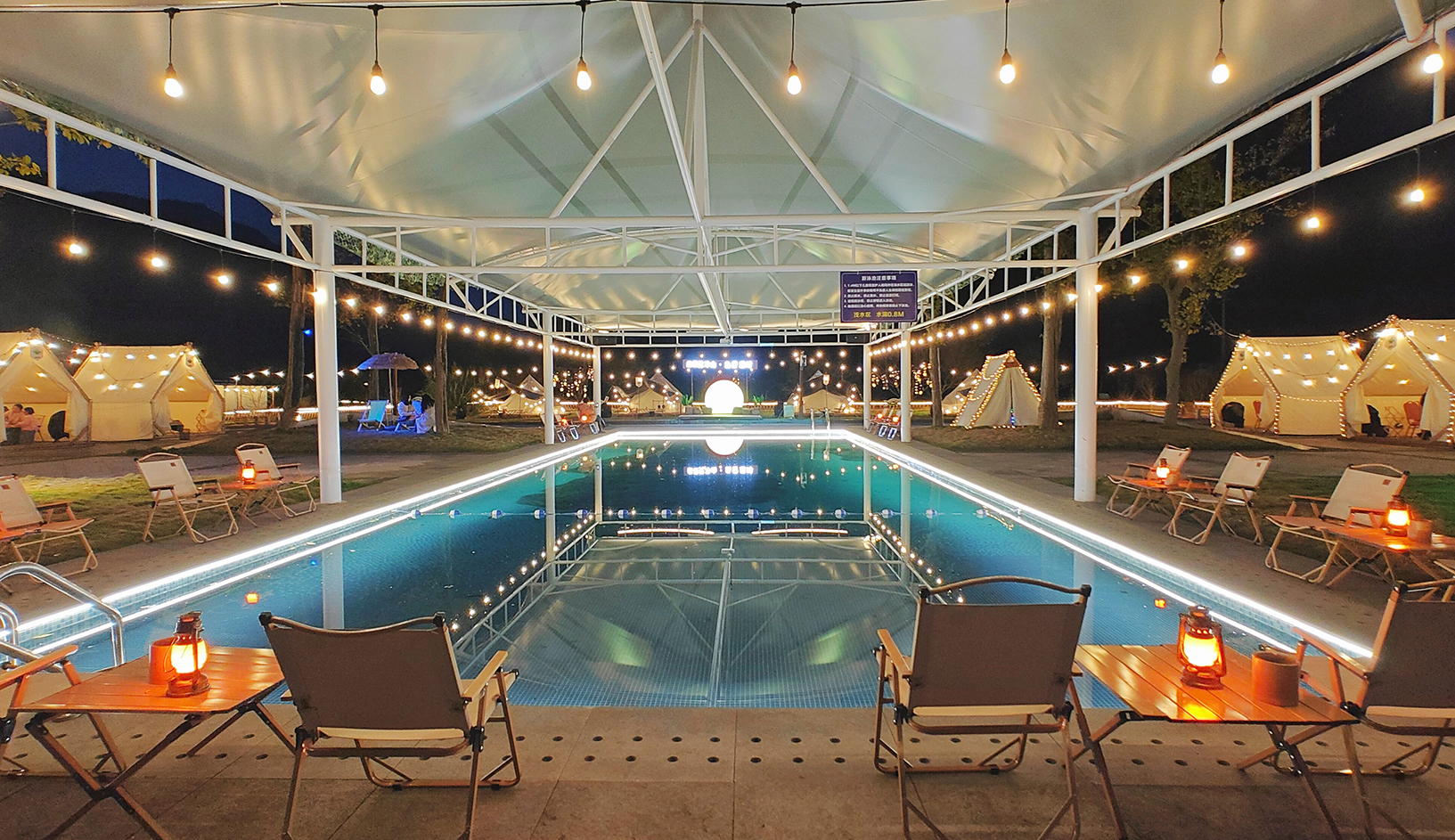 营地内设生态停车位109个,篷房8间,自助露营位20个,配有游泳池、K歌音响、生活超市、儿童无动力乐园、公共厨房、卫生间、淋浴间、洗衣间等综合配套设施。